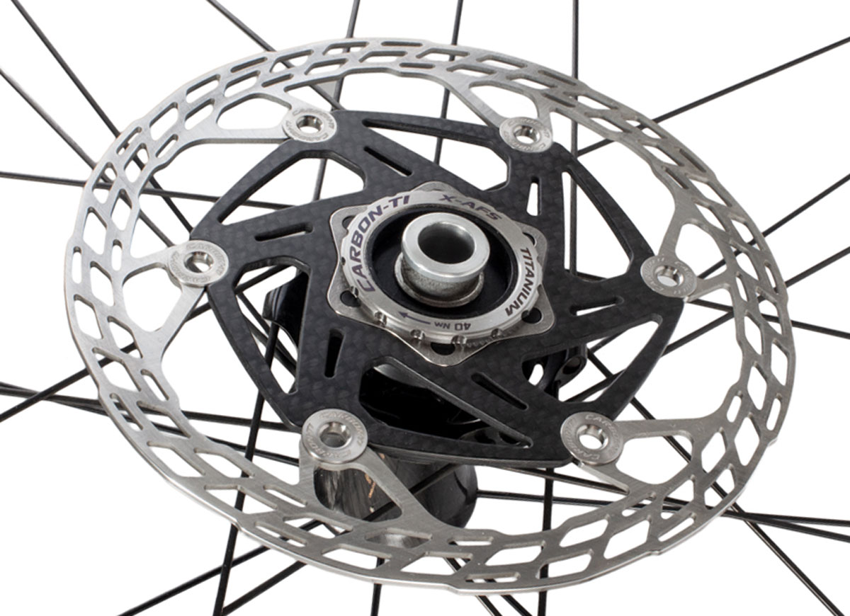 What’s AFS? It’s Campagnolo’s “Axial Fixing System” and simply refers to a slightly different design for the lock rings themselves. Otherwise, they’re essentially a Center Lock rotor, and Campy/Fulcrum AFS hubs come with AFS lock rings. Or, you can updgrade to these Carbon-Ti ones and get rotors with carbon carriers and titanium AFS-compatible lock rings. Available in 140/160/180mm diameters.