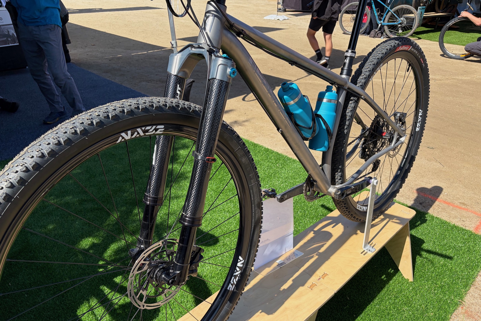 Nearby, Vittoria tires had a rigid Neuhaus NOVA32 on display to show off its new Peyote 32″ tires. This frame featured this simple yet classy paint job with what look like some 5DEV titanium cranks adding a bit of bling. It’s running a Shimano Deore Di2 drivetrain, TRP brakes, and some unbranded wheels with large hub flanges.