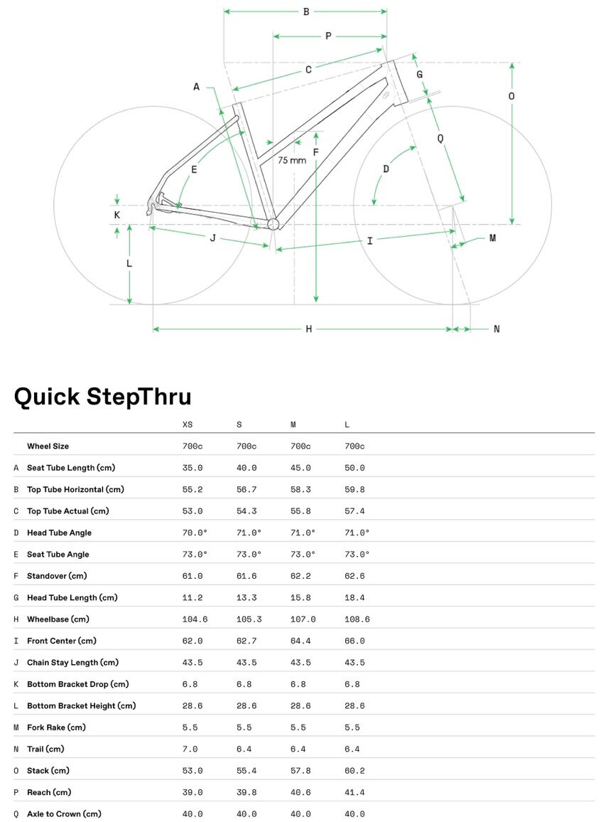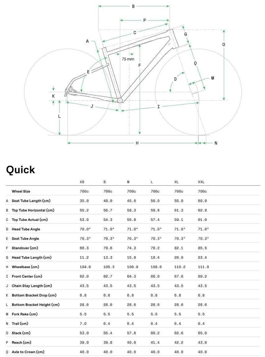 - Frame: Quick, SmartForm C3 Alloy, tapered head tube, Straightshot hidden cable routing, post mount disc, rack/fender mounts