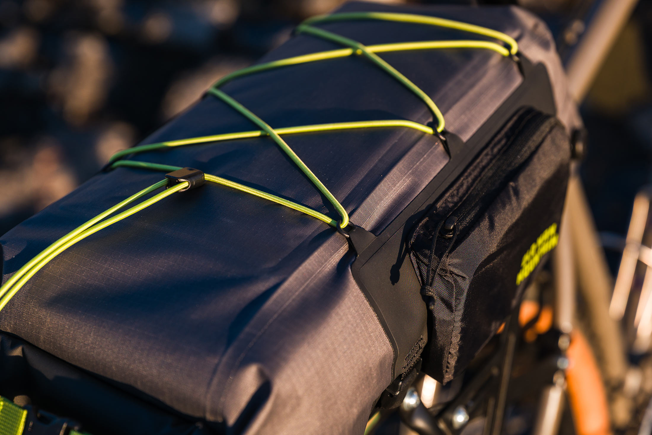 Top frame sheets keep its shape, including the front wedge to clear saddles. These also keep it from flopping side to side on rough terrain, and four straps secure it to your rack. Obviously they (and we) recommend using Old Man Mountain’s rock solid Divide Pannier Rack.