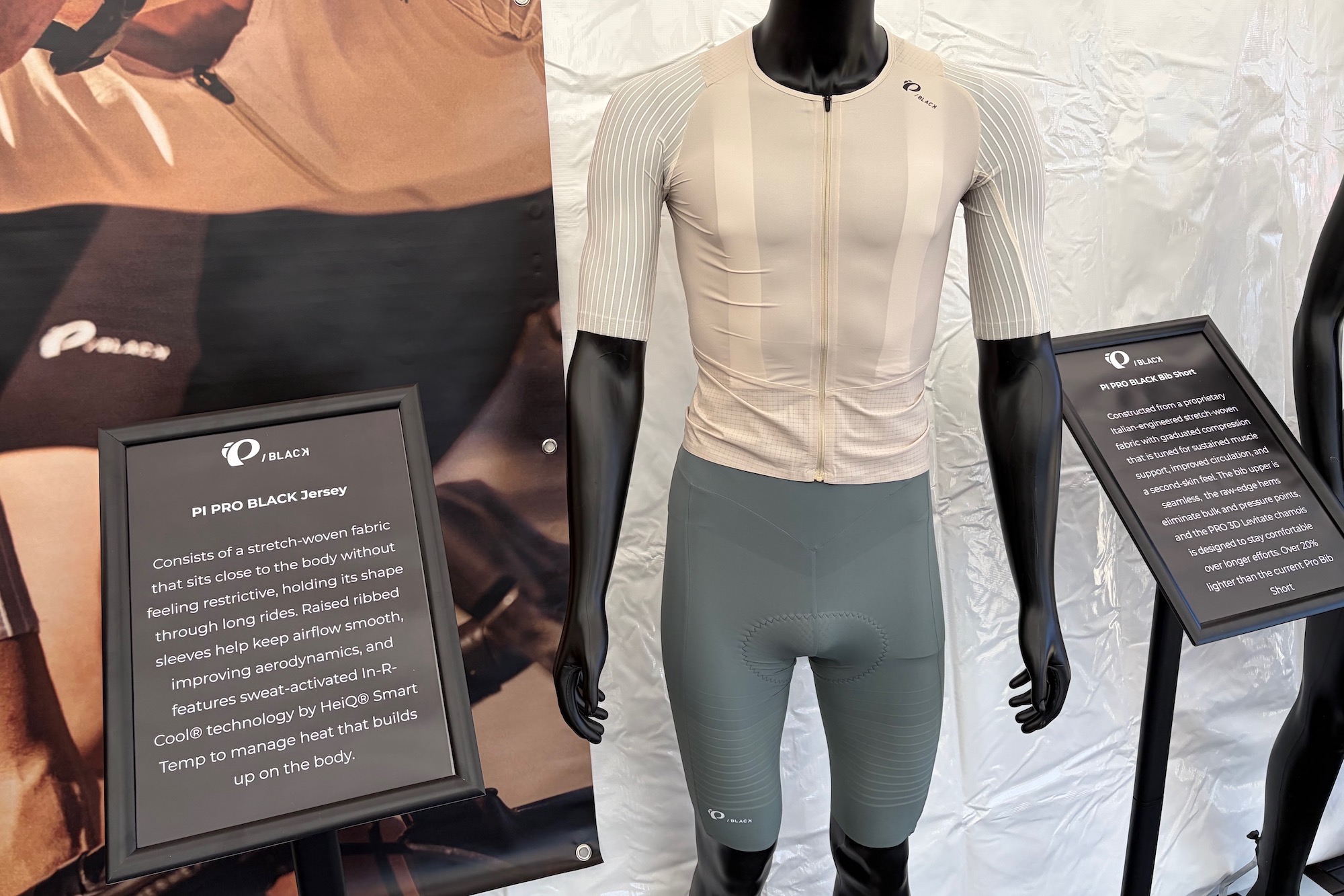 This is the brand’s second color-coded apparel collection this year, following the Pi/RED bibs and jerseys, which came out about a month ago. The new Pi PRO/BLACK apparel officially launched at Sea Otter, and I swung by the booth to check it out. Pearl Izumi also sent me a few pieces to check out ahead of time, so I have actual weights and some fit notes on its new race-oriented premium apparel lineup.
