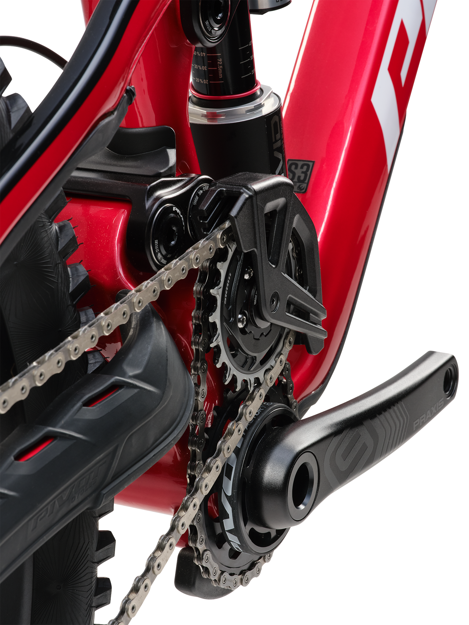 The more rearward axle path performed better when tackling square-edge hits and big chunk. However, with that rearward axle path, the concern is chain growth and pedal kickback. Typically, we see this mitigated by an upper idler pulley. However, Pivot chose to go with two chains and direct-mounted dual idlers. One chain connects an idler to the chainring, the other from an idler to the cassette.
