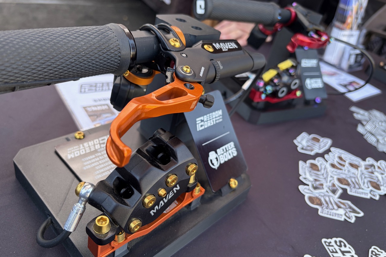 We’ve written about a few innovative products from ZENO before. Most recently, we featured the brand’s Q-Connector V2 Hydraulic Quick Coupler, which they had on display at the booth. We’ve also talked about innovative designs like their Reaction EX Floating Brake Rotors. But what really caught my attention was the well-organized display of colorful brake rotor adapters, dropper levers, and mechanical disc brake calipers. ZENO’s Speedclip Dual Mechanical Disc Brakes actuate both pistons simultaneously for even, smooth, and consistent braking performance. They come in a variety of colors, as well as flat-mount and post-mount versions.
