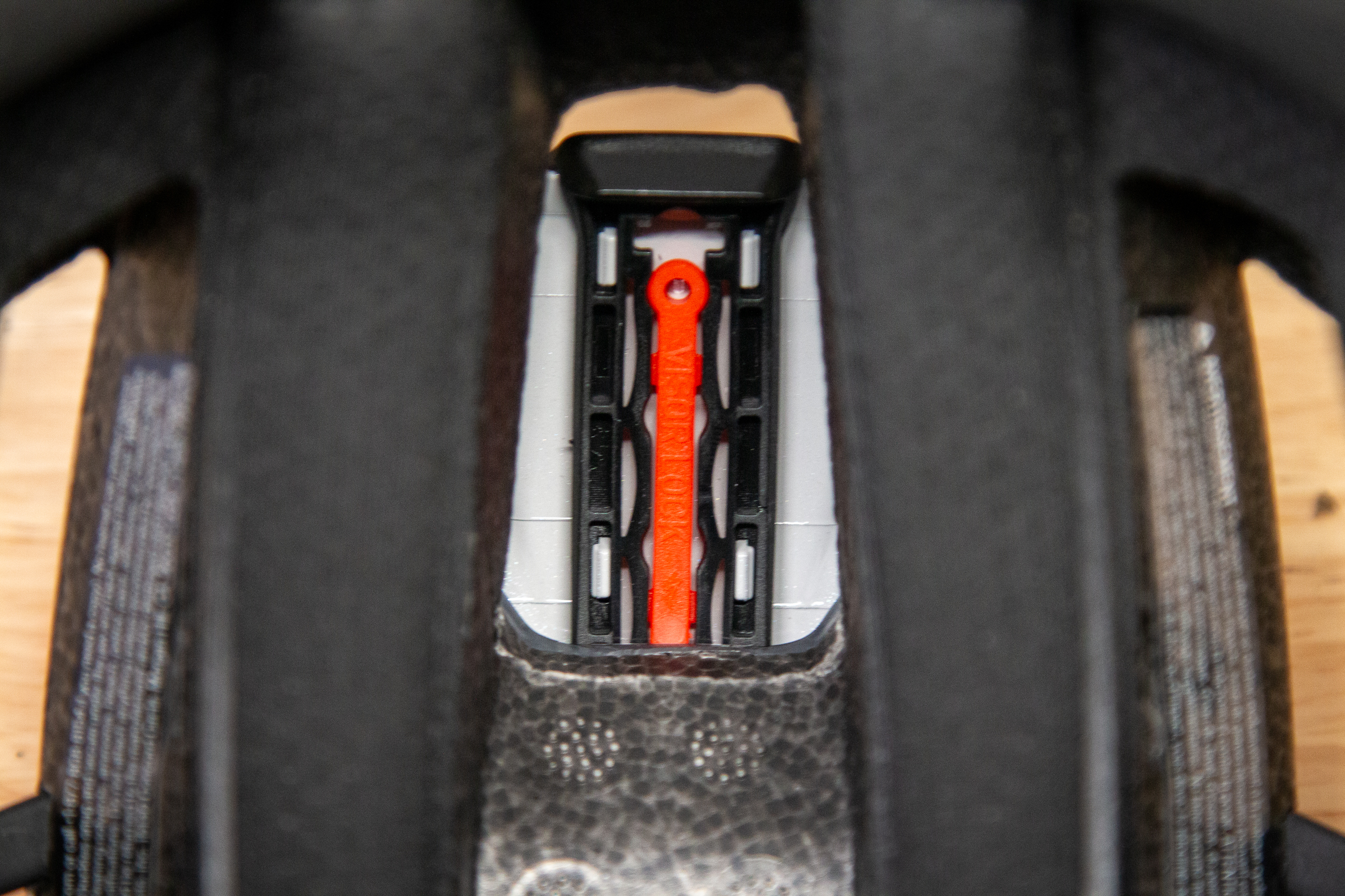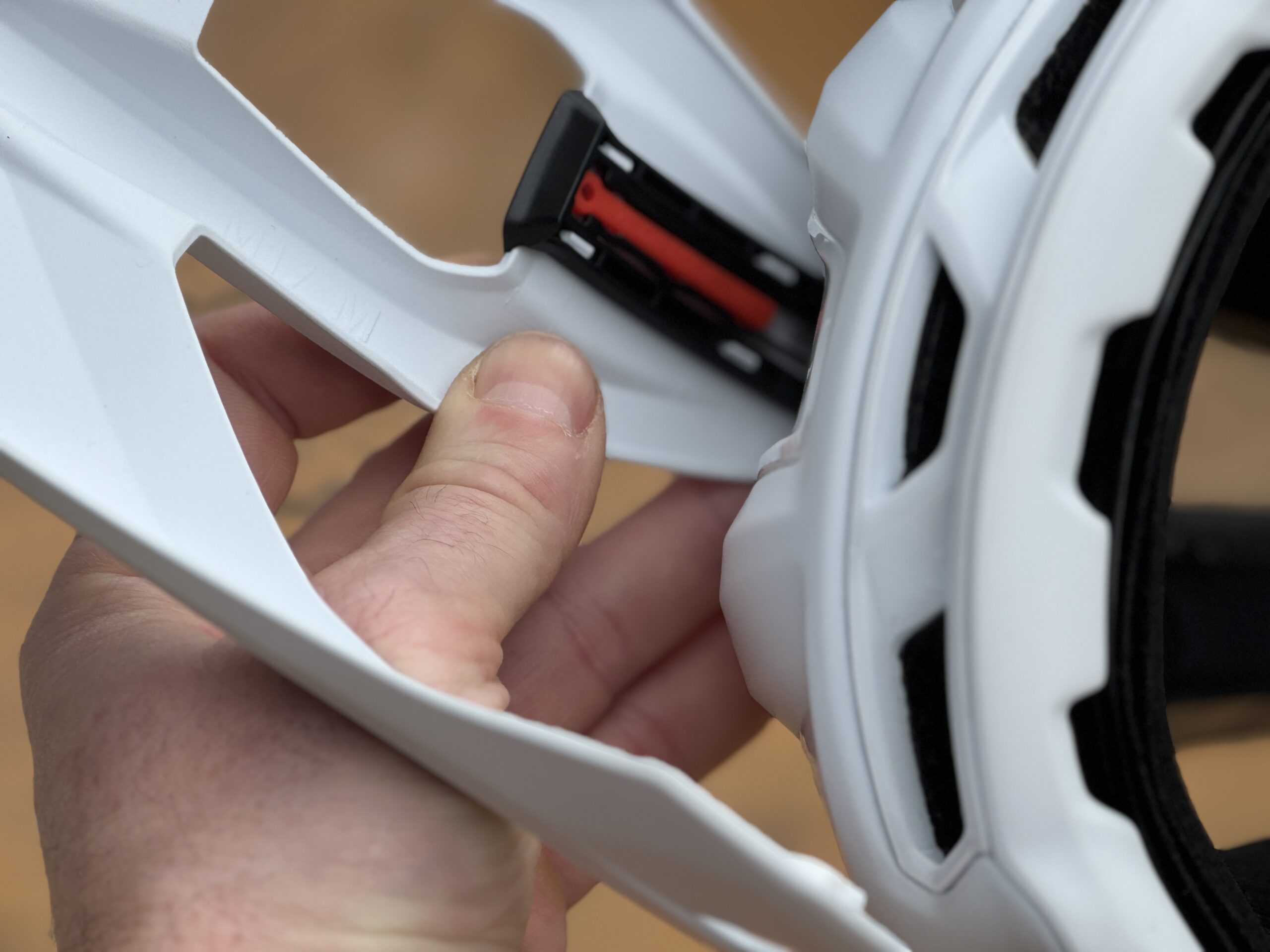 As mentioned, the helmet now includes a 4-way adjustable breakaway visor. To allow for light and camera mounting, the visor itself has a flat spot on the top that is the perfect size for an adhesive GoPro mount or similar. However, if you want to run a light or camera on your visor, you’ll ned to use the Visor Lock tab, which pops into the visor adjustment slot and prevents it from moving. Realistically, this tab is so small, you’re going to have to try really hard not to lose it, but it does have a small hole that could be used to tie it to your camera/light bag. Our sample helmet has a bit of play in the visor adjustment system, which causes a bit of a rattle, but we’re hoping to get it swapped out to confirm it as an isolated issue.