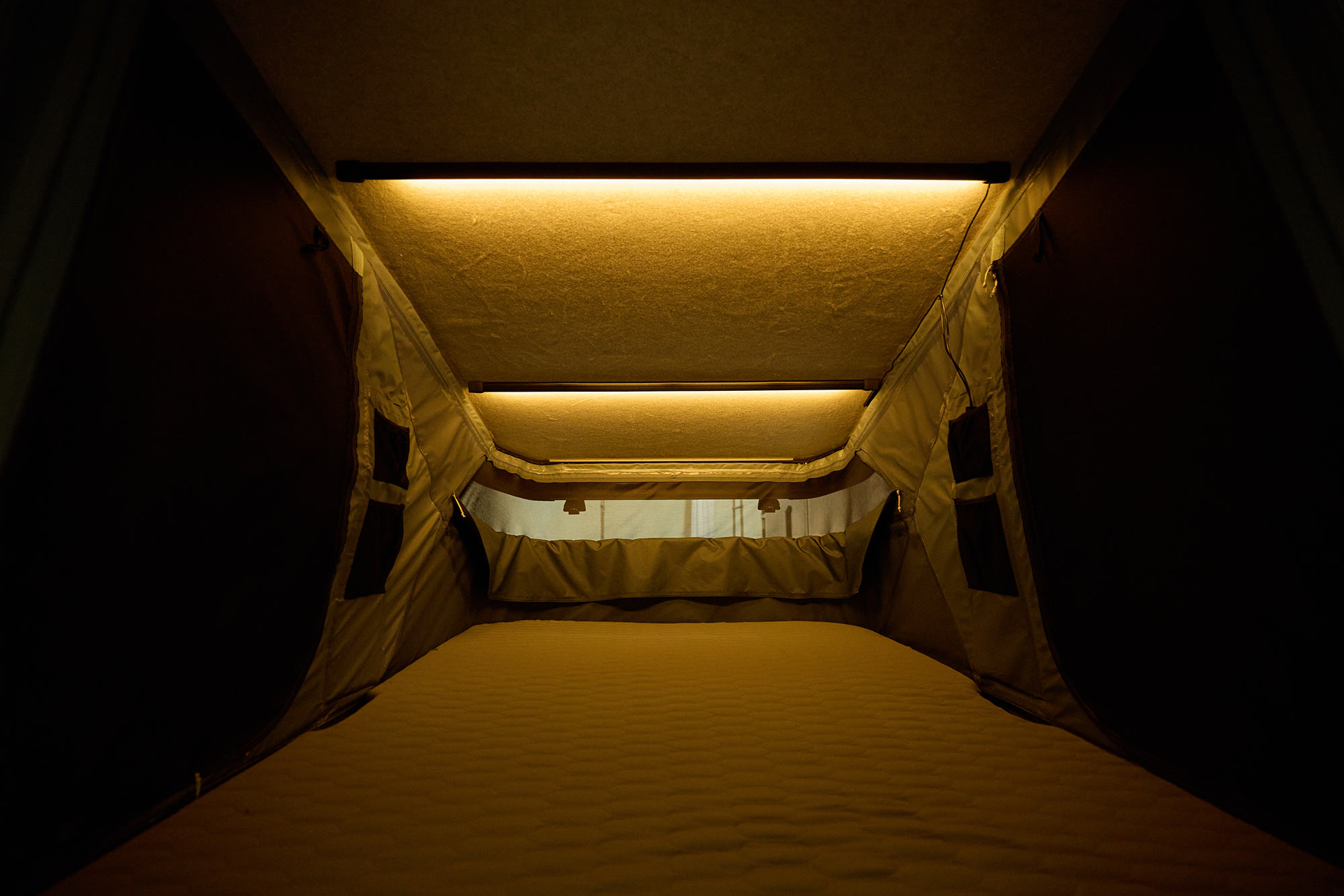 Tyler saw this in person at SEMA 2025 (video here, skip to 22:30, or just watch the whole thing for lots of killer new overland gear), and it’s impressive in its simplicity. Or, at least when it comes to opening and closing it. Just release a few latches, and it opens on its own. Then just pull the long corded handle to close it back up. The fabric self-tucks as it closes, and everything just compresses into the hardshell – easy peasy.