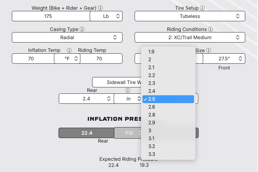 Previously, when choosing wheel size in the Mountain (Advanced) mode, you could choose wheel size, but it did not allow you to select front and rear independently to account for mixed wheel configurations. Now, rather than defaulting to both wheels being the same size, you can choose front and rear wheel diameters separately. This small change should make it easier for the many riders on mullet/MX/mixed-wheel mountain bikes to dial in their tire optimal pressures.