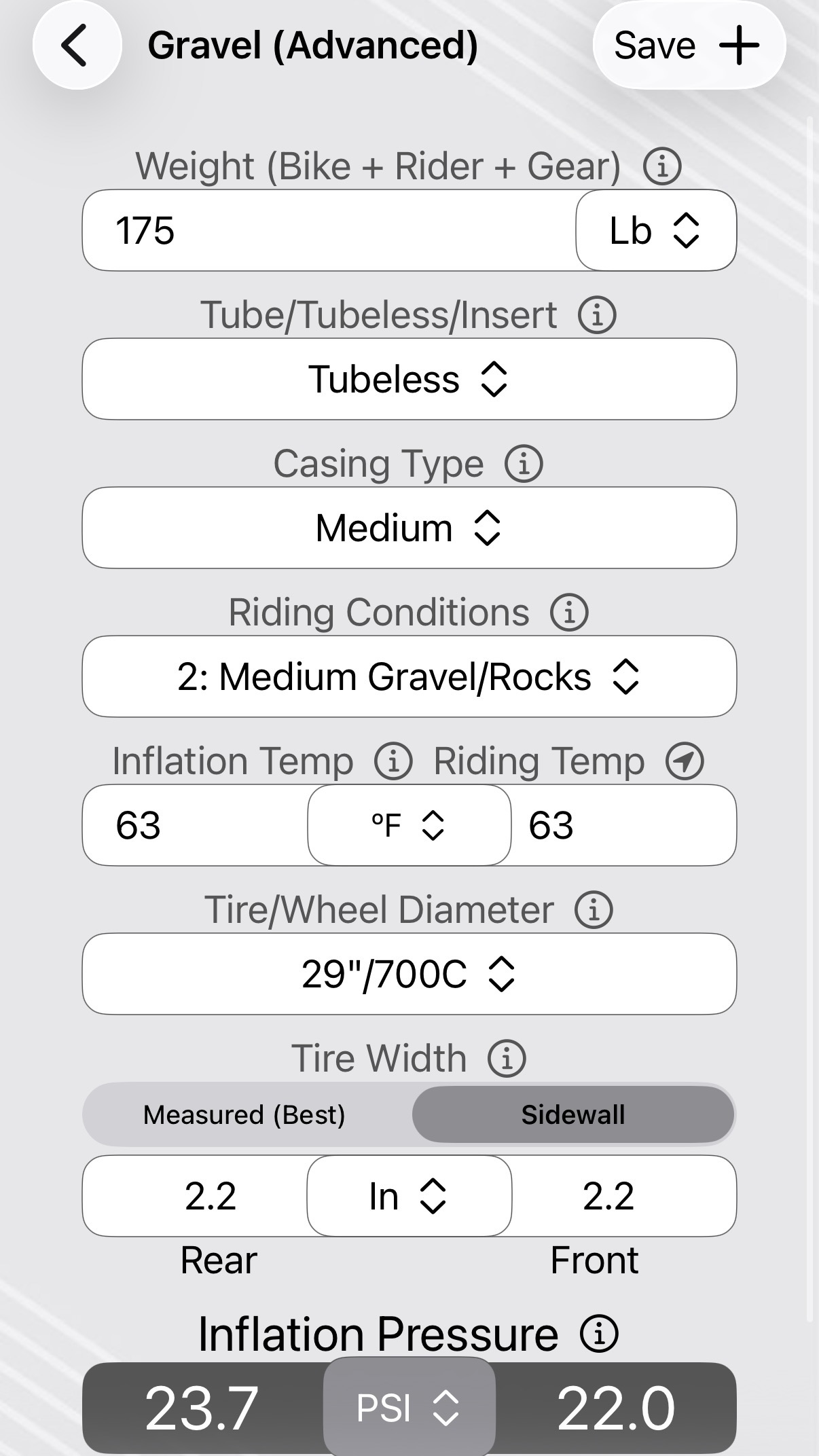 Since some modern gravel tires are just mountain bike tires with widths measured in inches, Wolf Tooth added the option to use inches for the width measurement on the Basic and Advanced Gravel modes. Now, you can choose between width in millimeters or width in inches, depending on the tires in question.